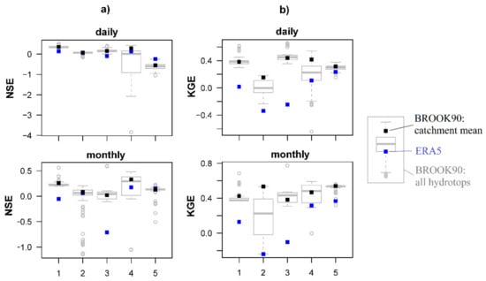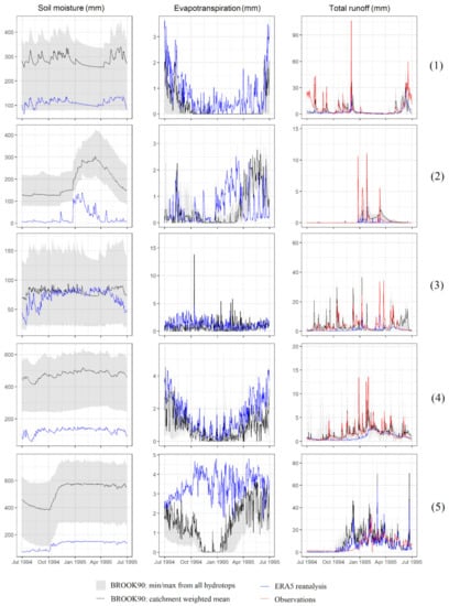 The performance and first validation of the results are discussed on the basis of five catchments from Iceland, USA, Canada, Germany, and Indonesia. They were selected for two reasons. First, they are located within different climate zones, and second, they have various relief, land cover, and soil texture (Figure 4, Table 2). To evaluate the performance of the package, two strategies were applied. The first one is to compare the runoff component to the observed discharge data provided by the Global Runoff Data Centre [90]. For the chosen catchments, the following observed time-series are used, respectively: 1979–2018, 1979–2006, 1979–2017, 1979–2016, 1979–2009. The second strategy is to compare the soil water content, evapotranspiration, and runoff to the similar variables available within the ERA5 reanalysis.