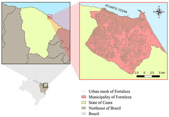 Fortaleza, the capital of Ceará, is in the Northeast region of Brazil, Figure 1. According to the Brazilian Institute of Geography and Statistics (IBGE) [23], Fortaleza has a population of 2,643,247 inhabitants and an area of 312.407 km2.