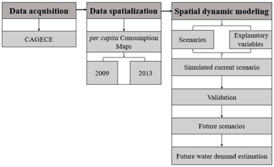 In order to predict the water demand of Fortaleza, future scenarios of per capita water consumption were simulated. The simulation was performed with geotechnology techniques and cellular automata theory, and divided into three steps: data acquisition, spatialization of data in matrices, and finally, dynamic modeling, Figure 2. The water micro-metering data, which refer to data on user consumption, was collected from the Ceará Water and Wastewater Company (CAGECE) for the period between 2009 and 2017.