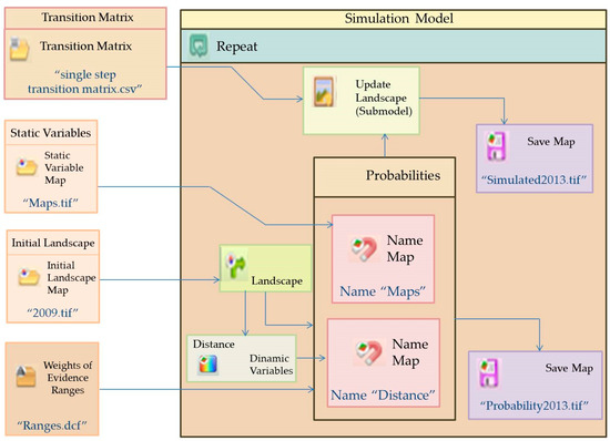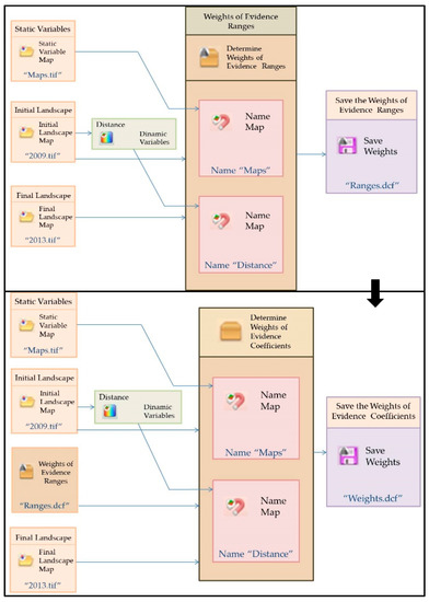 In the stage of determining the weights of evidence, the static variable and dynamic variables are inserted in the model. The difference map (static variable) was obtained by a matrix subtraction in QGIS, specifically, between the maps of the year 2009 and 2013. The distances for the consumption classes that have undergone transitions (dynamic variables) were calculated within the simulation model of the EGO Dynamics software, using the “Calc to Distance Map” (“Distance”) function. Thus, both the static variable and the dynamic enter the simulation model from the stage of determining the weights of evidence (Figure 3).