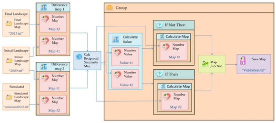 After defining the parameters, annual simulations were generated from the initial and final maps. Model performance was validated through the fuzzy similarity index, developed by the Remote Sensing Center of the Federal University of Minas Gerais (CSR/UFMG). This index is based on the fuzzy similarity index created by Hagen [30]. Two maps of difference were compared: the first obtained from the initial and observed final maps, and the second, obtained from the initial map and the simulated final map (Figure 5). An exponential decay function with a window size of 11 × 11 and a constant decay function, calculated with the following window sizes: 1 × 1, 3 × 3, 5 × 5, 7 × 7, 9 × 9 and 11 × 11, were adopted. The window sizes are grids of pixels, where each pixel corresponds to an area of 900 m2 (30 m × 30 m).