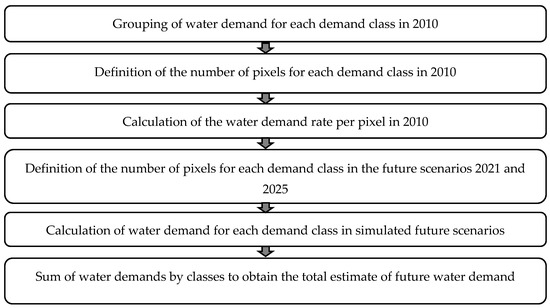 Future water demand was calculated by multiplying the demand/pixel rate by the number of pixels in each class of water demand. Consumption data of 2010 have been used as reference, Table 2. Thus, for scenarios 2021 and 2025, water demand was estimated using a “per pixel” rate, based on the amount of pixel for each demand class, that is, water demand rate per pixel x number of each demand class. Figure 6 shows a summary of the steps taken to estimate future water demand.