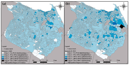 (a) Average urban water consumption in Fortaleza (L/inhabitant/day) during 2009. (b) Average urban water consumption (L/inhabitant/day) during 2013.