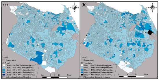 (a) Average urban water consumption in Fortaleza (L/inhabitant/day) during 2017. (b) Simulated average urban water consumption (L/inhabitant/day) for 2017.