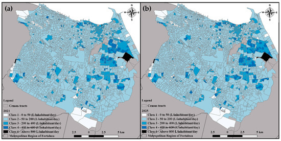 (a) Simulated average urban water consumption in Fortaleza (L/inhabitant/day) for 2021. (b) Simulated average urban water consumption (L/inhabitant/day) for 2025.