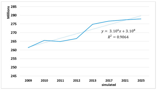 A linear regression analysis (Figure 10) showed a growing trend of the urban water demand in Fortaleza (R2 = 1.0). In addition, it demonstrates the temporal evolution of urban water demand according to the simulations performed in this study.