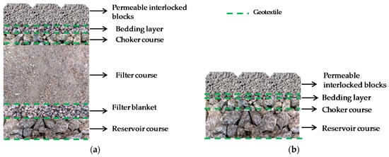 | Choker course | Mechanical support, surface levelling, reservoir layer, and filtration | Washed gravel aggregates containing few fine particles, continuous particle size with a minimum voids volume of 32%. When sized as a reservoir layer, the voids volume must be greater than 40% [13]. The particle diameter should be between 4.75 mm and 25.0 mm. | The thickness depends on the structural and hydraulic pavement design. In general, the thickness is 25.4 mm when used as a damping layer and 100 mm when it is also used as a temporary reservoir [14,15]. |