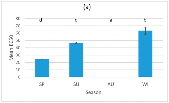 Table 1 shows the physicochemical parameters on the leachates of the four sludges tested for both leaching tests. As can be seen on Table 1, the sludge sample of spring showed the highest moisture content and EC, while pH was the lowest, for the EN 12457-2 leaching test. On the contrary, for the same leaching test, the summer sample showed the highest pH and the lowest EC. Figure 1a–d shows the EC50 values for D. magna and % inhibition values for V. fischeri for each season for both leaching tests. Table 2 shows the TUs calculated according to [34] for the four sludges and for both leaching tests and organisms tested. As can be noticed in Figure 1a–d and Table 2, the spring sample showed the highest toxicity on D. magna, while the autumn sample showed the lowest toxicity for both leaching tests. Actually, there was no EC50 available for D. magna for autumn for the EN 12457-2 leaching test; this means that the undiluted leachate did not produce toxicity in at least 50% of the organisms. This is also shown in Table 2, where the corresponding TU is only 0.7. On the contrary, V. fischeri showed slightly toxic results for the spring sample, and the autumn sample showed the highest toxicity for the EN 12457-2 leaching test and the second highest for the NEN 7341 leaching test.