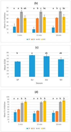 EC50 values for D. magna for each season (a,c) and % inhibition values for V. fischeri for each season (b,d) for ΕΝ 12457-2 leaching test (a,b) and NEN 7341 leaching test (c,d). No EC50 could be calculated for AU sample in Figure 1a. Key: different letters denote statistically significant differences between the tested groups (repeated measures ANOVA followed by post-hoc HSD test).