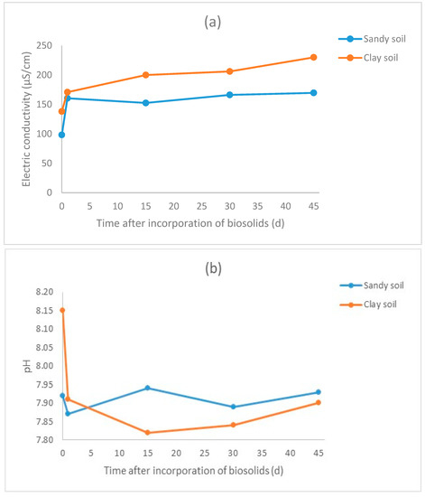 In the mixtures of biosolids and soil that were created, no acute toxicity against the tested organisms was observed. None of the leachates were able to cause toxicity 50% or above; as such, no EC50 or IC50 could be calculated. Again, V. fischeri was sturdier than D. magna since most of the leachates (from the ΕΝ 12457-2 method, which was the only one performed on the biosolid/solid mixtures) caused an increase in bioluminescence and not inhibition. This may be due to the ion-rich mixture of biosolids, which usually contain large amounts of K, Ca and Mg [44]. These elements, in the form of their cations, may enhance sulfur-dependent luminescence in various ways in V. fischeri [45]. As such, any possible toxicity was counterbalanced by this enhancement. The general lack of toxicity is in contrast with other field applications of biosolids; [46] noticed significant toxicity on D. magna (48 h test) and on plants when treated sludge was utilized, at 23 tn/ha (water elutriates). The authors of [47] noted toxicity to V. fischeri, dependent on the type of soil and time elapsed after incorporation, at 90 tn/ha (ΕΝ 12457-2 leachate). On the contrary, [48] did not observe significant toxicity (water elutriates, 24 h test, 22 tn/ha) for D. magna after biosolid application, on Day 40. However, there was up to 20% decrease in D. magna survival, in the worst-case scenario (runoff or drainage) on Day 1. In relation to these results, the examined biosolids, even at 80 tn/ha, seem to be an innocuous solution. Regarding physicochemical parameters, pH reduction was only observed in the clay soil. Generally, studies have shown that pH reduction is expected right after incorporation of treated sludge [49]. On the other hand, biosolid incorporation significantly affected the electrical conductivity and nitrates and nitrite concentrations in the leachates. This was also found in the research study of [50]. Mainly in clay, but also in sandy soil, nitrate and nitrite accumulation increased significantly as time elapsed since biosolid incorporation, as also confirmed in the studies of [21,25]. In the former study, two of the main factors controlling the rate and extent of NO3− were biosolid type and time duration since biosolid incorporation. Moreover, in that study, the anaerobically digested sludge was the biosolid that showed the greatest NO3- accumulation potential due to its large content of NH4+-N. In the latter study, similar biosolid application rates accumulated NO3−-N up to three times as much in clay than in sandy soil.