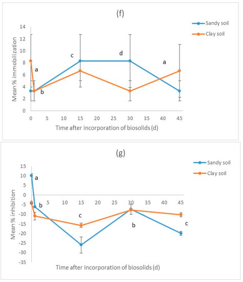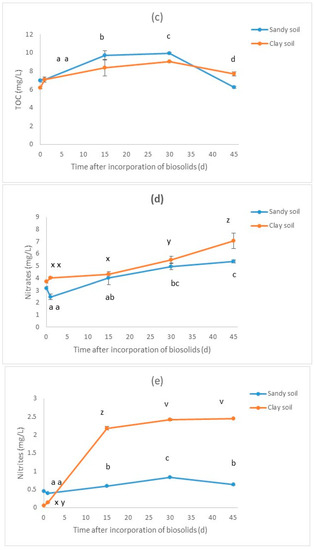 Different values are noted in relation to time elapsed for the measured parameters (Table 3). As shown in the line time charts (Figure 2a–g), the time elapsed since the biosolid application affected most of the parameters tested. For the TOC parameter, repeated measures ANOVA was conducted to explore the impact of soil type and the time elapsed since the biosolid application. The interaction effect between soil type and time duration was not statistically significant, (F = 3.18, p = 0.149). There was a statistically significant main effect of the time elapsed, F = 8337, p < 0.001. Post-hoc comparisons showed that samples on Day 1 were not significantly different from Day 0, but, except for Day 45, but they were different from samples on Day 15 or on Day 30. For nitrates, the interaction effect between soil type and time elapsed was highly significant, (F = 64.059, p = 0.001). There was also a statistically significant main effect of the time elapsed, (F = 5875, p < 0.001) with nitrates increasing and staying high on Day 45. For nitrites, the interaction effect between soil type and time elapsed was again highly significant, (F = 39,483, p < 0.001), while the time elapsed significantly increased nitrite leaching (F = 213,368, p < 0.001). On the contrary, both control and biosolid/soil samples were not acutely toxic for the tested organisms D. magna and V. fischeri. There were differences between timepoints especially for V. fischeri and for D. magna (F = 947.43, p < 0.001 and F = 14.23, p = 0.02 respectively). Furthermore, there was no apparent difference in response between clay and sandy soil for these two tests.