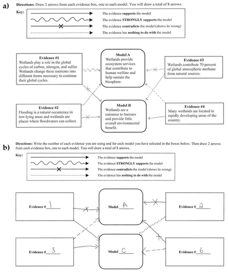 This present study examined and compared how plausibility judgements and knowledge construction shifted based on the two different types of MEL diagrams: pre-constructed model–evidence link diagrams (pcMEL), and a build-a-MEL (baMEL) diagram. (Figure 1) The pcMEL diagrams present four lines of scientific evidence and two models (scientific alternative and other alternative), as in previous studies [11,25]. In the baMEL, students constructed their own diagram to extend the topic and selected four new evidence lines from eight choices and two new alternative explanatory models from three choices (scientific, engineering, and non-scientific alternatives). With the completion of the MEL diagrams, students will then select and further analyze model–evidence relationships and evaluate the relationship between the two. By building and evaluating their own MEL diagrams, we hypothesized that students would activate greater levels of conceptual agency (i.e., as authors of their knowledge contributions, students would have increased accountability to the classroom community and explicit authority to reason) [27]. If so, then a theoretical and practical contribution of the present study could suggest that deeper conceptual agency activated by the baMEL instructional scaffold has the potential for: (a) strengthening students’ evaluations about the connections between lines of scientific evidence and alternative explanatory models; (b) promoting greater shifts in plausibility toward the scientific alternative; and (c) increasing science learning about water resources. This is in line with a theoretical account of increased transfer effects associated with conceptual agency [27]. In the present study, the MEL diagrams focused on two topics concerning water resources, specifically wetlands’ role in ecosystems (the pcMEL; Figure 1a) and future freshwater availability (the baMEL; Figure 1b).