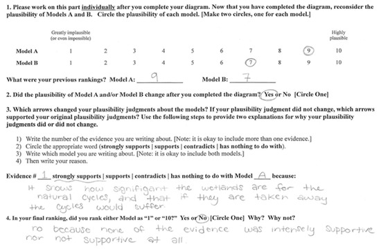 Near the beginning of the school year and prior to participating in either treatment, students performed the “plausibility ranking task” as an introduction to the ideas of plausibility and critical evaluation. This task asked students to rank the importance of different types of evidence for determining the plausibility of an explanatory model. These four types of evidence were the same as the links that students later indicated on the activities: evidence that supports the model, strongly supports it, contradicts it, or has nothing to do with it. After ranking the importance of each from 1–4, they read a small passage on falsifiability that states scientific ideas cannot be proven but are rather disproven through opposing evidence, and were then asked to rank the types of evidence again. This provided an introduction to the idea of plausibility for students and an initial look at the comfort with which they can evaluate the roles of scientific evidence.