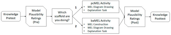 Students first completed the knowledge survey and the plausibility ratings. Then, students completed each pcMEL (1) and baMEL (2) activity over about two regular periods, after which they completed another knowledge survey and plausibility ratings. The only difference between the two MEL activities is that in the baMEL, students were chosen to pick the models and evidence statements.