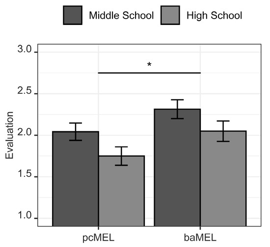 We ran a mixed-model univariate ANOVA with evaluation scores as the dependent variable, instructional treatment as a within-subjects factor, and whether students were in high school or middle school (school level) as a between-subjects factor. The ANOVA revealed that there was no interaction effect between treatment and school level, F(1,106) = 0.02, p = 0.89. However, the main effects were significant for both instructional treatment, F(1,106) = 7.40, p < 0.05, η2G = 0.03 (small effect size) and students’ school level, F(1,106) = 5.33, p < 0.05, η2G = 0.03 (small effect). As shown in Figure 4, students’ evaluation scores were higher for Freshwater baMEL (M = 2.19, SD = 0.88) than the Wetlands pcMEL (M = 1.91, SD = 0.80), and that middle school students’ evaluation scores (M = 2.18, SD = 0.84) were higher than high school students’ (M = 1.90; SD = 0.84).