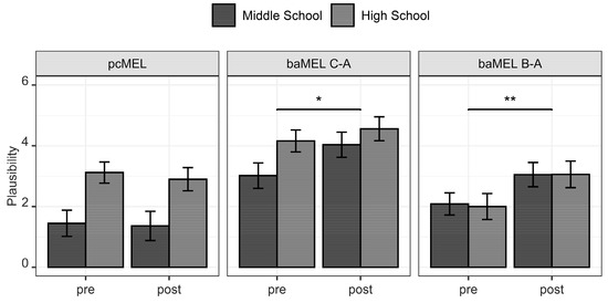 Plausibility scores (range: 1 (highly implausible)–9 (highly plausible)) for each instructional treatment. Errors bars indicated ±1 standard error. Asterisks indicate a statistically significant difference between pre- and post-instruction, * p < 0.05, ** p < 0.01.