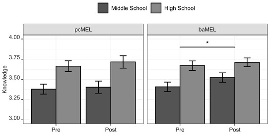 Knowledge scores (range 1 (strongly disagree with scientific)–5 (strongly agree with scientific)) for each instructional treatment. Errors bars indicated ±1 standard error. Asterisk indicates a statistically significant difference between pre- and post-instruction for middle school students completing the Freshwater baMEL, * p < 0.05.