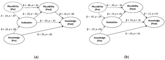 We conducted a structural equation modeling (SEM) analysis to examine relations between evaluation, plausibility (pre- and post-instruction) and knowledge (pre- and post-instruction) scores, for both topics (wetlands and freshwater resources). We specifically conducted partial least squares (PLS) analyses using Warp PLS v.4.0 statistical software [35], to examine the various relationships between the different variables. The partial least-squares method is based on ranked data and is distribution-free, which allows for more statistical power without compromising or inflating the chance for Type I errors for a large range of sample sizes and variation of group sizes [36]. PLS-SEM analyses have been used increasingly often in social science research [37] and are being used more frequently in educational research [11,38].