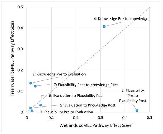 Figure 7 shows the two SEMs. The arrangement of variables and pathway connection structure is based on Lombardi and colleagues’ [14] theoretical model relating to evaluation, plausibility, and knowledge. Standardized path values shown on the figures indicate relative strength of the seven model pathways. We also compare the two SEMs in Figure 8, which shows a scatter plot of individual pathway effect sizes, which is another indicator of the strength of individual pathways. First, the models shown in Figure 8 verify Lombardi and colleagues’ [14] theory that the indirect pathways between evaluation and post-instructional knowledge (i.e., the two pathways from evaluation to post-instructional plausibility to post-instructional knowledge) were stronger than the direct pathway between evaluation and post-instructional knowledge. This was the case for both the Wetlands pcMEL and the Freshwater baMEL. Second, in comparing the two models (Figure 8), although the strength of the pathway between evaluation and post-instructional plausibility was roughly the same for the two MELs, Pathway #7 between post-instructional plausibility and post-instructional knowledge was appreciably stronger (~3.5 times stronger) for the Freshwater baMEL. Further, the strength of Pathway #2 between plausibility pre-instruction and plausibility post-instruction in the Freshwater baMEL was only a fraction (~2%) of the Wetlands pcMEL. Taken together, these two comparative results reveal that the Freshwater baMEL deactivated prior plausibility judgments more effectively than the Wetlands pcMEL, with students relying more on their evidence to model link evaluations facilitated by the Freshwater baMEL.