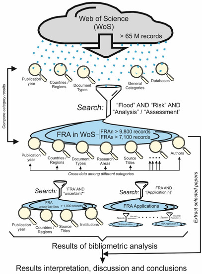 Bibliometric studies have become widespread in many fields since 2006. In medical science, this technique has allowed us to analyze the emerging trends, and in economics and finance it has allowed us to discover useful information that is not visible using other bibliographical approaches [16]. In the scientific field of FRA, the relevant literature has been abundant (over 7000 references; see the following sections), but there are not many bibliometric systematic analyses (less than 20 references). Only partial bibliometric analyses are available: urban flood risk in China [17]; urban flood vulnerability [18]; coastal flooding [19]; group decision-making techniques for risk analysis and assessment [20]; environmental risks and impacts [21]; multi-criteria decision-making methods in risk analysis and assessment [22]; availability of global-scale datasets to support the study of water-related disasters [23] and among other specific topics and regional reviews. The objective of this global review is thus to carry out a bibliometric analysis of all FRA literature using a well-known worldwide database: Web of Science (WoS).