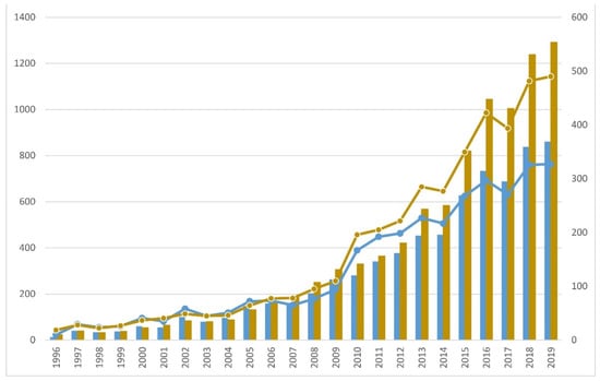 In the past 25 years (1996–2020), there has been a significant increase in publications on FRA, greater than one order of magnitude, and this growth has continued over time, without any significant decreases. FRA is thus an emerging discipline that has not reached its peak. Curiously, the series shows that when there is a large annual increase in publications, the following year is often similar (or even decreases slightly), forming pairs of characteristic years of growth stabilization, such as 2006–2007, 2013–2014, 2016–2017 and 2018–2019. The most significant increases occurred between 2014 and 2015, and between 2017 and 2018 (Figure 2). These could be related to international provisions or programs that provide impetus for the scientific-technical community, such as the application of the European Flood Directive (EC 60/2007) and its successive cycles, although perhaps with a time lag due to the editing and publication times of the manuscripts. This progressive increase in records over time follows a parallel evolution with the WoS database as a whole, although there is a sharp drop in WoS records between 2009 and 2010 that is not reflected in the temporal evolution of FRA records. Quite the contrary, FRA publications show an increase in the number of registrations per million (Figure 2), which may be related to the effects of the aforementioned European Directive, with a delay of three years.