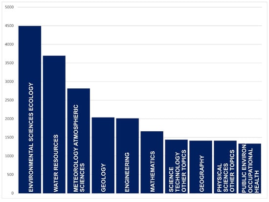 Bar chart showing the number of FRAs references (records) in WoS databases classified by ‘Research Areas’, indicating the ten main areas.