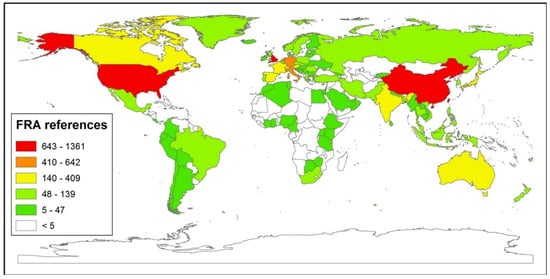 World map showing the number of FRAs references (records) in WoS databases classified by ‘Countries /Regions’, indicating the top 100 countries.