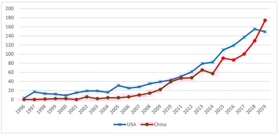 Temporal evolution (1996–2019) of FRAs references (number of records) in WoS databases classified by ‘Countries /Regions’, comparing production by the US and China.