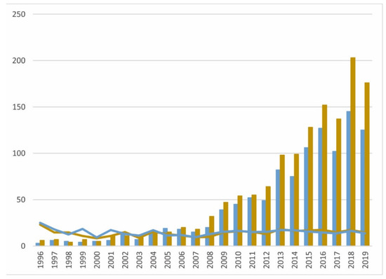 The geographical distribution of the countries and regions of the FRA articles, based on the study area and author affiliation, was heterogeneous. The records associated with the United States of America (19.2% FRAn and 18.1% FRAs) stand out, followed at a distance by those from the People’s Republic of China (14% FRAn and 12.7% FRAs) and England (10.5% FRAn and 12% FRAs). A succession of European countries (Germany, Italy, The Netherlands) held a smaller percentage (6.5–9%), in addition to other developed countries of Europe, Oceania, North America and Asia (Figure 5). It is a reflection of North American leadership in science and technology in the late 20th century-early 21st century and the Anglo-Saxon dominance in scientific journals, especially in the source titles contained in the WoS. However, the emerging scientific production of FRA in China has been gaining on the US in the past years (and surpassed it in 2019; Figure 6). This is due to the huge population of China and its growing university community, the fact that flood risk is one of the main problems of this country, and the incisive policies of scientific and technological production that have led to the opening of specific sections for Chinese authors in bibliographic databases such as the WoS.