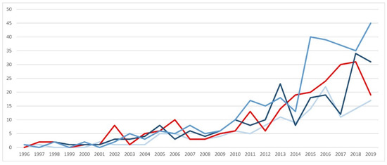 Temporal evolution (1996–2019) of FRAs references (number of records) in WoS databases classified by hydrologic–hydraulic methodologies: red line, flood frequency analysis; clear blue, rainfall–runoff transformation; middle blue, hydrologic modeling; deep blue, hydraulic modeling.