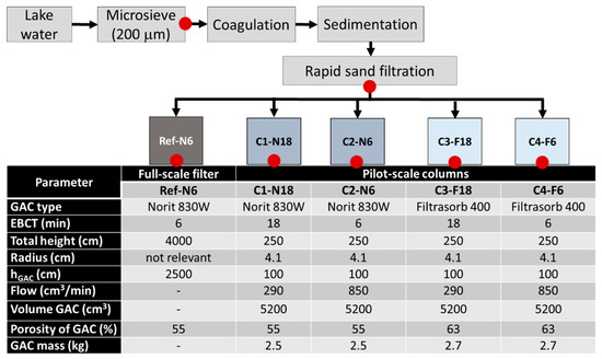Schematic diagram of treatment in the full-scale granulated activated carbon (GAC) filter (type Norit 830W) and pilot-scale GAC columns (Norit 830W and Filtrasorb 400), and parameters used in treatment. EBCT = empty bed contact time; hGAC = height of the GAC in the filter and columns (cm); red dots represent sampling locations for OMPs.