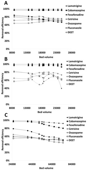Removal efficiency profiles as a function of number of bed volumes for seven organic micropollutants in granulated activated carbon pilot-scale columns: (A) containing Norit 830W (C1-N18) and with an empty bed contact time (EBCT) of 18 min; (B) containing Filtrasorb 400 (C3-F18) and with EBCT of 18 min; and (C) containing Filtrasorb 400 (C4-F6) and with EBCT of 6 min.