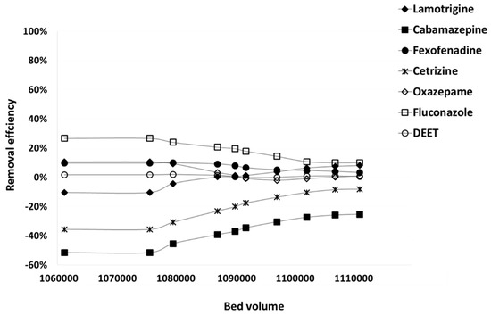 No removal was observed for DEET, which can be explained by its low adsorption affinity to GAC (see Section 3.1). Negative removal, i.e., a higher outgoing than incoming OMP concentration, was observed for carbamazepine, lamotrigine and cetirizine. All three compounds are relatively resistant to biodegradation [30], and thus are probably more prone to later release than compounds degraded on the GAC biofilm. However, the removal efficiencies for carbamazepine, lamotrigine and cetirizine increased after 155,000 BVs. This increase in removal efficiency for lamotrigine can be explained by an increase in its concentration in the feed water, from 10 to 25 ng L−1 from June to October 2017 (Figure S1). Previous studies have shown that OMPs and DOC can compete for pore sites, and that DOC can block pore sites on GAC, resulting in a decrease in the adsorption capacity of GAC for OMPs over time [10,13,31]. However, it has also been shown that DOC concentration is not sufficient for explaining OMP breakthrough behaviors [7].