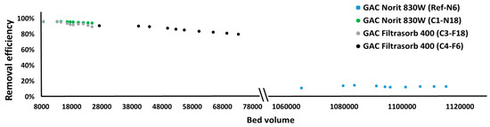 The removal efficiency of the seven OMPs in the full-scale GAC treatment plant (Norit 830W, Ref-N6) was considerably different from that in the pilot-scale GAC columns (C1-N18, C3-F18, C4-F6) (Figure 5). For the full-scale GAC treatment plant, the first sampling started at approximately 129,000 BV, and the average treatment efficiency of ∑OMPs was consistently low (<20%) until 155,000 BV. For the pilot-scale GAC columns, the removal efficiency of ∑OMPs decreased slightly, from 90–95% at 20,000 BV (C1-N18, C3-F18, C4-F6) to ~80% at 75,000 BV (C4-F6). These differences between the full-scale and pilot-scale results can be explained by the age of the GAC (GAC in the full-scale test was used for >13 years; GAC from pilot-scale columns was used for <1 year).