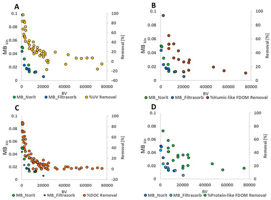 Change in methylene blue (MB) kinetic sorption factor as a function of the number of bed volumes (BV) for the granulated activated carbon types Filtrasorb 400 (light blue, columns C3-F18, C4-F6) and Norit 830W (dark blue, column C1-N18) compared with removal of (A) UV (light orange), (B) humic-like fluorescent dissolved organic matter (FDOM) (dark brown), (C) dissolved organic carbon (dark orange), and (D) protein-like FDOM (green). Percentage change for all columns (n = 4).