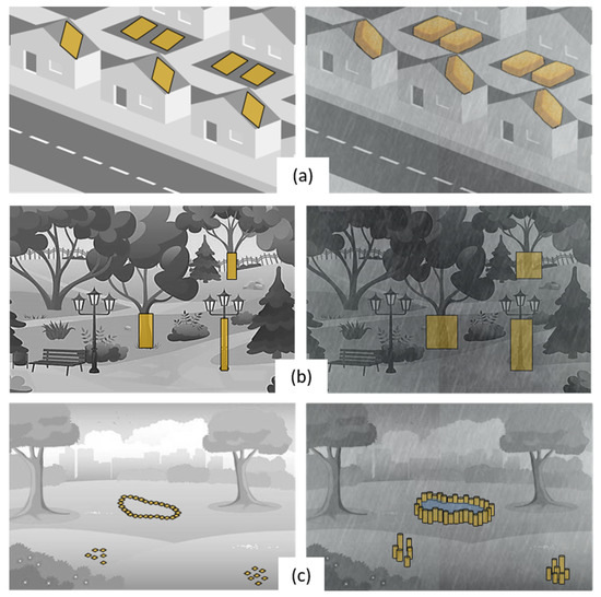 Theoretical concepts: (a) Down-flow sponge-like porous bodies (SPB) storage; (b) Up-flow SPB storage with the pre-installed vertical structures expanding horizontally; and (c) Up-flow SPB storage with new vertical structures growing up from the ground when absorbing water. Note that the SPB storage sketches presented in the figure are intended just to elucidate the theoretical concept of such storage, without any aesthetic, practical or placement considerations.