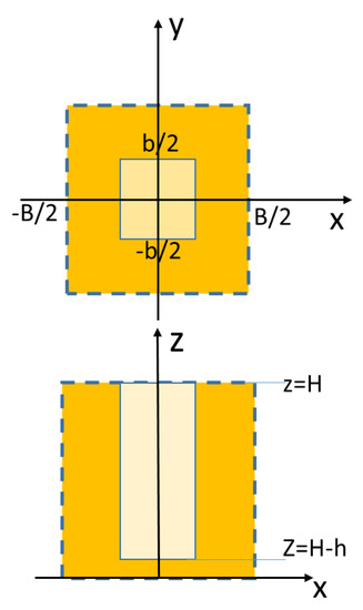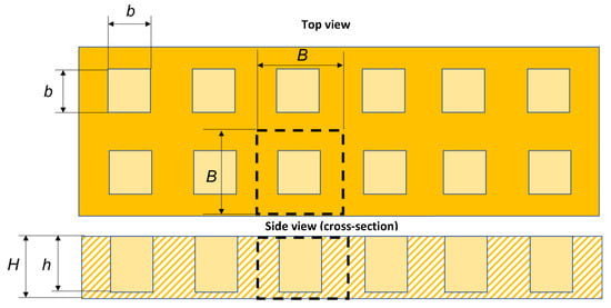 Regardless of D, the rate of water uptake is enhanced by a large area of contact between the absorbing material and the water, Aab, as shown in Equation (3). So instead of using a flat surface area of the absorbing material the interface with the water should be corrugated in some way. As an example, let us study a prismatic block of absorbing material, with a plan view area, Aflat, height (thickness) H, and a grid arrangement of relatively small cavities, with a square cross-section b × b in plan, and depth h, shown in Figure 2. In such a simplified porous medium body, repeating square cells can be described by a plan dimension (side B), and height H, in Figure 2. Now also let b′ = b/B and h′ = h/B and observe that 0 < b′ < 1 and 0 < h′< H/B. The total contact area between the water and the absorbing material may now be derived as: