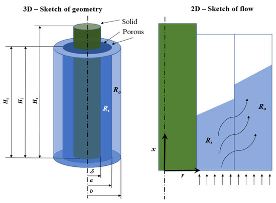 The capillary pressure, Equation (7), created between the rods within the annular clusters induces both radial and axial components of the flow. These components need to be calculated for each time step, depending on the positions of the flow front in both the inner and outer annular porous media, as illustrated in Figure 3. The pressures in the annular porous media are pi(x, r, t) and po(x, r, t), respectively, where the flow and pressure are assumed to be independent of the azimuthal co-ordinate and the fluid is set to be incompressible. The perpendicular, i.e., in the radial direction, and parallel permeabilities, i.e., in the axial direction, in the annular porous media are denoted as , , , and , respectively. Darcy’s law, Equation (5), may now be expressed as: