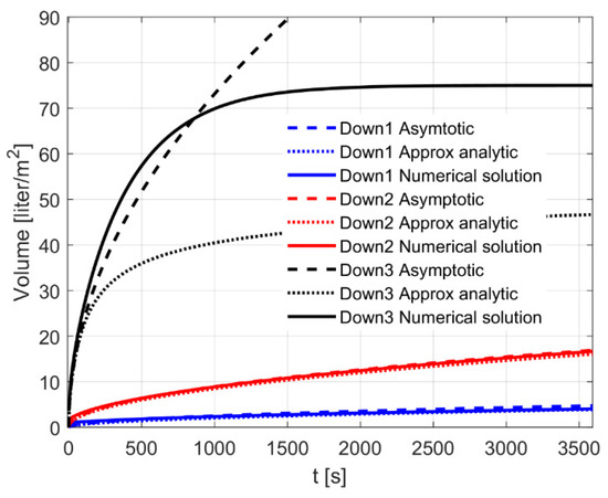 In Figure 5 the absorbed water volume diffusing into the volume Vab is plotted as a function of time for the three cases in Table 1 and for the three solutions. The solid line is the numerical result, the dotted line is the approximate analytical solution, Equation (22), and the dashed line is an asymptotic solution valid for short times, Equation (23). For cases Down1 (blue lines) and Down2 (red lines), the numerical and approximate analytical solutions overall agree quite well, but for short times there is a slight disagreement since the numerical solution cannot capture the rapid t1/2 initial development of the analytical solution. For case Down3 (black line), the agreement for short times is good, while for long times only the numerical solution fulfills the correct asymptotic volume of 75 L. The analytical solution here becomes invalid, because the boundary layers are no longer small compared to the dimensions of case Down3. It should be noted that Down1 and Down2 also approach the correct asymptotic volume, which takes a long time. The agreement with the analytical solutions and the final volume of water for all cases indicates that the numerical solution is correct.