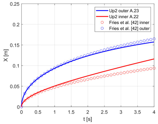 The results of the model can be verified and validated for the case of flow in a single channel with no porous medium, but including the effects of gravity. This is the famous experiment of capillary rise in a tube, with the well-known approximate analytical solution by Washburn [23]. More recently, Fries and Dreyer [42] found an exact analytical solution for this case and also tested it experimentally, with good agreement. For the case of flow in two annular regions, the maximum heights reached in the two channels (see Equation (25), in Supplementary Materials) can be verified by energy arguments. In the initial phase of the development of the fronts in each channel, when the interaction between the channels is zero, the expressions for the fronts Equation (24) in Supplementary Materials also agree with the results of Fries and Dreyer [42]. In Figure 6 a comparison is shown between the numerical results for the inner and outer channels given by Equations (22) and (23), in Supplementary Materials and the result obtained by using the analytical solution of Fries and Dreyer without any interaction. It is seen that, during this initial phase, in which there is a small interaction between the channels, the agreement is good. In the work by Zarandi et al. [27] the analytical solution by Fries and Dreyer [42] was also validated for porous media. In their case the porous medium consisted of several different kinds of glass-fiber wicks. The agreement between theory and experiments is good for several cases while for other cases there is a clear difference. The conclusion is that the disagreement in some cases can be derived from inhomogeneities, caused by ‘kinking’ fibers in the porous medium. Hence, the theory of Fries and Dreyer [42] provides an upper bound of the experimental data. In this context it is also important to mention that the surface energies (contact angle) may play an important role and that there are measures to reduce this angle as shown by Caglar et al. [29]. Including additional mechanisms, Caupin et al. [43] derived an upper limit for the capillary rise, which on the nano-scale was very large and exceeded Jurin’s law. Experimental evidence is still required.