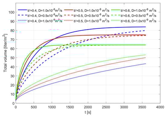 The value of B, which is the scale of water/SPB interface corrugations shown in Table 1 and Figure 2, influences the volumetric flow rate to a large extent, as evident from comparing the solid lines of different colors in Figure 5. Hence, the smaller the scale studied, the faster is the overall absorption process. For the smallest scale, Down3, where the sides of the open squares are 10 mm, the 1 m2 flat surface can absorb around 75 L in 15 min. The sensitivity of the results due to diffusion, D, is given by the absorbed volume dependence on square root of the diffusion coefficient, according to the asymptotic expression (23). It only affects the growth of the volume in time, not the total absorbed volume: see the difference between the solid lines m2/s, the dashed lines, m2/s, and the dotted lines m2/s in Figure 7. In this context, the variation of the parameter (=b/B, see Figure 2) is also interesting. Although this parameter should be set large for rapid growth, a large value of yields a smaller total volume of absorption, as best seen by scrutinizing the solid lines of different colors in Figure 7. Here blue lines denote , red , and green . The effect of varying H is close to linear and increases both the initial rate of growth as well as the total absorption.