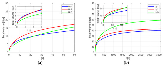 Water uptake [liters] as a function of time [s] for the three cases studied (Table 2). Graphs in the two panels correspond to two time intervals: (a) 0–1 min and (b) 0–1 h, respectively. Graph colors: the blue, red and green curves denote cases Up1, Up2 and Up3, respectively.