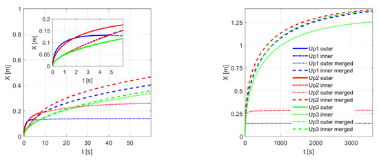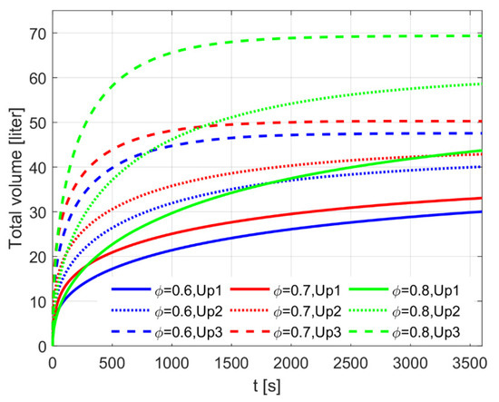 In all three cases in Table 2, one can anticipate initially fast inflows into both porous media, followed by a slowdown in the inflow (see Figure 8a,b). The graphs, however, reveal that, in the three cases studied, the water uptake differs. Initially the water uptake is fastest in case Up1, during the period 0 < t < 2 s, as shown in Figure 8a. Then, during a period up to slightly more than 100 s, the water uptake is greatest in case Up2, (Figure 8b). After that, the water uptake in the system with almost equal radii (Up3) dominates. Hence, the storage set-up with two porosities can be designed for both a fast water uptake, as well as the maximum volume of water uptake. The maximum water uptake is about 8, 20 and 46 L, for durations of 10, 100 and 1000 s, respectively.