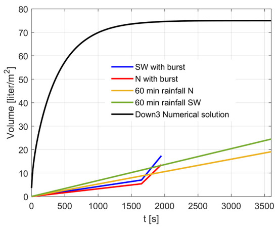 Comparison between the Down-flow SPB storage filling (Down3, numerical solution) [L/m2] and the cumulative rainfall ([L/m2] data from Table 3) as a function of time [s]. The figure also demonstrates the storage capacity of the SPB.