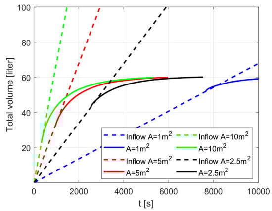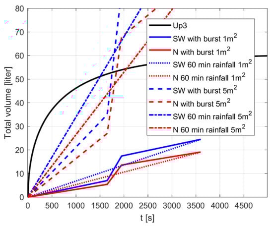 Comparisons of cumulative rainfall volumes and Up-flow SPB (Up3) storage filling (black solid line) for a constant rate of inflow (SW region) and various runoff contributing areas: blue—1 m2, black—2.5 m2, red—5 m2, green—10 m2.