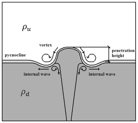 The interaction between jets and the pycnocline is studied based on the parameters mentioned above. During the rising process, the density of the jet at the pycnocline entrance is equal to the density of lower layer due to the jet entrains the surrounding fluid [17]. After the jet penetrates the pycnocline, the momentum of the core of upward flow rapidly decays due to negative buoyancy when the jet penetrates through the pycnocline. Then the jet falls back and impinges on the pycnocline after reaching the maximum penetration height. As a result, internal waves are generated at the pycnocline [19,20,21,22]. Figure 1 is the schematic diagram. Ezhova [19,20,21] compared the theoretical results based on the conservation of energy with the LES results and indicated that the theoretical penetration height was related to , but the penetration height was overestimated at the largest Frt because turbulence during the entrainment was not taken into account. Cotel [22] analyzed the entrainment and the coherent structure after the jet penetrated into the upper layer. It was found that with the effect of the shear force caused by the counterflow of the jet, vortices with opposite directions were formed in pair on both sides of the pycnocline. Druzhinin [18] indicated that the jet maintained a stable state after breaking through the pycnocline when the Froude number was less than 2. However, when the Froude number was greater than 2, the jet began to oscillate, which would be accompanied by the generation of internal waves.