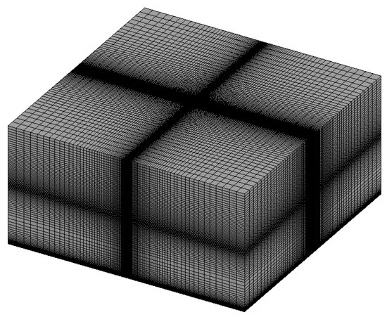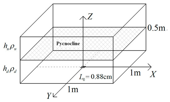 As shown in Figure 2, a 3D numerical model is established to study hydraulic properties of the interaction between a vertical jet and a pycnocline. The size of water tank is 1 m × 1 m × 0.5 m in x, y and z direction respectively. The non-uniform grid system is adopted to save computation costs. As shown in Figure 3, the whole computational domain is discretized into 100 × 100 × 80 nodes, and the time step is 0.001 s corresponding to the grid scale. Due to the inaccuracy in simulating the round nozzle with rectangular grid, a rectangular nozzle is adopted instead, which is also used by Chen [26]. The nozzle (width L0 = 0.88 cm) is located at the center of the bottom in the stratified environment. The velocity of jets in our cases is in the range of 0.2 m/s to 1.0 m/s. The pycnocline is located at z = 0.25 m. ρu and ρd are the density of upper and lower layers, respectively. hu and hd are the height of the upper and lower layers, respectively. The density of the jet is the same as that of the lower layer.