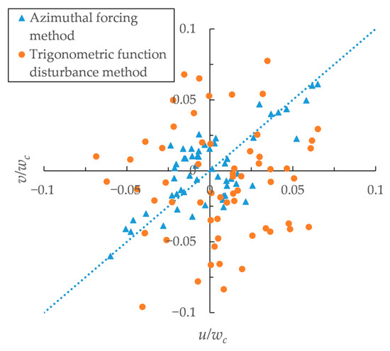 Although employing the azimuthal forcing method can achieve ideal vertical velocity decay of jets by several scholars [32,33], the velocity distribution of the jet in the horizontal plane is difficult to yield to the Gaussian distribution. Because only sine function is used in azimuthal forcing method which causes the correlation between u and v. After applying the TFD method, there is a difference with a period of π/2 in disturbances between the x and the y directions. Therefore, it can be guaranteed that the u and v components of the jet velocity are uncorrelated. In order to compare the traditional azimuthal forcing method with the TFD method, the u and v at the plane of Z = 20 from the results simulated through two methods are extracted and a plot of the values of u/wc and v/wc is shown in Figure 4. It can be seen that the points obtained through the TFD method distribute randomly in the uv plane, while the points obtained through the traditional azimuthal forcing method almost make up a line of u = v, namely the u and v are uncorrelated by employing the TFD method.