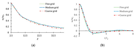 To illustrate that the grid size used in this paper does not affect the calculation results, cases A0 and A9 are separately simulated by a coarse grid system (80 × 80 × 60) and a fine grid system (150 × 150 × 110). The comparisons between these two grid systems with medium grid system (100 × 100 × 80) which is adopted in the verification are shown in Figure 6. As shown in Figure 6a, the vertical velocities at the jet axis in three different grid systems have little differences. It proves that the medium grid size can accurately simulate the jet. As shown in Figure 6b, the vertical velocity profiles of jets at the pycnocline in fine and medium grid systems have little differences. It proves that the medium grid size can accurately simulate the interaction between jets and the pycnocline.
