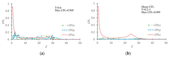 The courant (CFL) number varying with Z at the jet axis. (a) Instantaneous CFL. (b) Mean CFL.